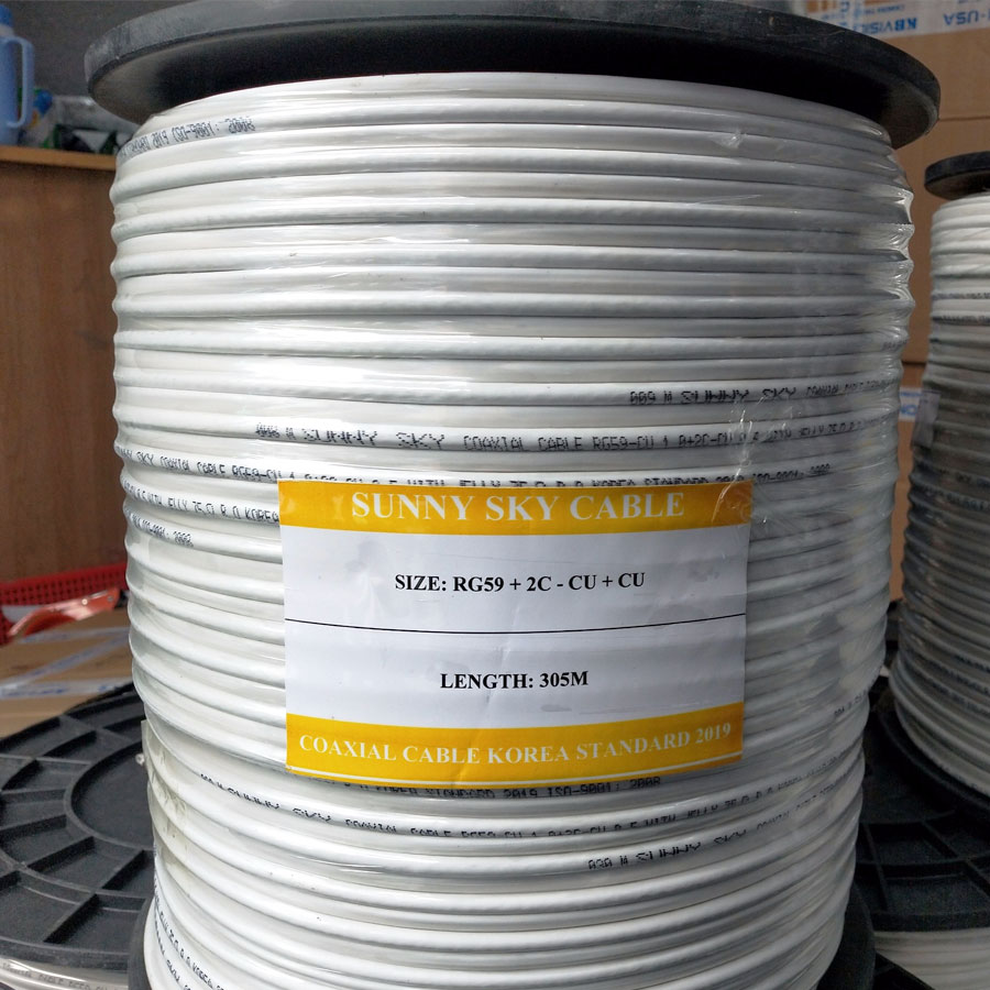 Dây cáp đồng trục Cáp đồng trục liền nguồn Sunny Sky RG59+2C – CU+CU 1.0 cuộn 305 mét được sử dụng cho hệ thống camera quan sát.